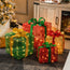 - Featuring a sturdy steel frame, this decoration set is stable enough and not easy to deform. The wrapped threads are colorful and durable. With the IP44 waterproof power adapter, you can safely light these boxes up. 140 LED lights will make warm white lights to bright up your room. Each gift box is decorated with an exquisite bow.